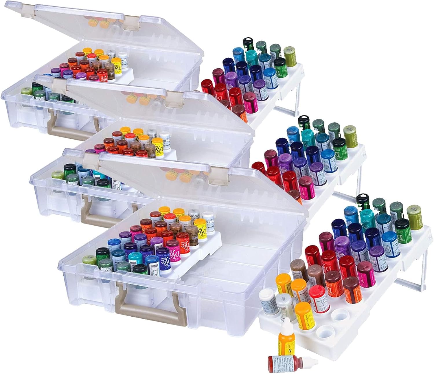 Store all of your glitter glues in this convenient container! This plastic storage container has two plastic trays with slots to hold thirty-two jars, for a total of sixty-four in the container. Each tray has a kickstand feature. This package contains one 15x14x3-1/2 inch container with a handle for easy transportation. Imported.
